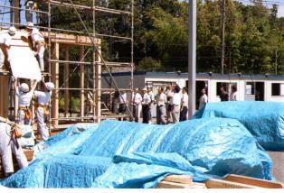 ●屋外での住友林業・新入営業社員への木造体験実習(棒隅木をチームで製作中) |