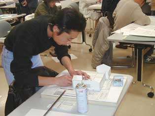 当日、2年生は、地下実習場で、「木造施工実習」の最終段階として、「規矩術」による「棒隅木」の墨付け、刻み作業が行われていた。狭い室内だが、ベテラン指導員のもと、真剣な表情で取り組む熱気に圧倒された。 1年生は、3階教室で、「プレゼン演習」として「住宅模型」を製作中。和やかな雰囲気で進められ、参加した日本建築専門学校の菊池理事長から、激励の挨拶をいただいた。 建物は、都心駅近くの地下1階地上3階建て。非常に狭いビル形式(狭いため、通常の施工実習は、別の「練馬実習場」で行う)だが、ところ狭しとパネルや実習製作品が並べられ、普段の授業の様子がよく伝わって来た。 作品では、「プレゼン」「製図」「CAD」、各種の「構造模型」作品、「卒業製作」の独自作品などが並べられ、意欲的な授業の一端が伺われた。 また、飯能への「林業実習」、商店街と一体となった「カレッジ祭」、冬の「長野研修旅行」、修了前の「奈良研修旅行」など、林業や地域、伝統建築などへも幅広い関心を育てようとの、新しい試みも行われているという。 |