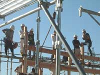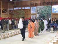 2年次の実習では、これまで、地域連携により、木造の新築・解体・移築再生のほか、文化財の修復、地域おこし、古民家・ギャラリー・寺院・茶室・門・土蔵・庭園など、実に多彩なプロジェクトが実践されて来た。 これらは、材料費等を除いて無償で行うが、マスコミ等を通して反響を呼び、地域から次々と協力依頼が寄せられ、今や3年先までふさがっているという。実践中のプロジェクトは年間通じて数ヶにものぼり、企画や段取り調整が指導陣のもう一つの重要な仕事でもある。 この日、建築大工コースの「民家」専攻2年生が校外で実習中と聞き、早速、現地に引率してもらった。 建物は、山麓近くのスキー客向けの多目的センターで、「大黒柱、四方差し、貫構法」など伝統的構法を駆使した建物を、総勢20名余りで「建て方」中であった。在学中に実際の建設に携わることで、実践力や緊張感を育てようとする迫力が感じられた。移動のために、マイクロバス4台、トラック、ユニック車なども整備と言う。