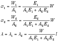 これから分かるように,荷重WはA1E1,A2E2の比率によって円柱と円筒に分配されていることが分かります.AEは伸び剛性と呼ばれますから(第3話に登場),確かに「圧縮に強い方がそれだけ大きな力を受け持っているに違いない」という推測がここで裏付けられました.