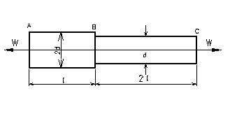 図4.1 のようなアルミニウムの段付棒に引張荷重が作用するとき全長の伸びを求めよ.ただし,l=100mm,d=15mm,W=5.88kN,ヤング率E=73GPaとする.
